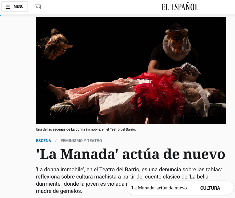 La 'La donna immobile' habla de la violación., sin oportunismos. Es una obra que nace a partir del cuento original de Giambattista Basile en el que se basa 'La bella durmiente'. La obra es una reflexión sobre la cultura de la violación en la que vivimos todos y sufren fundamentalmente las mujeres.
